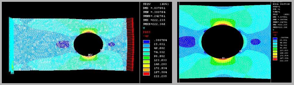 | 平板に円形穴がある場合 穴直径= 幅/2 ; 応力集中係数=
