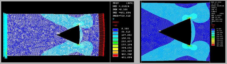 | 平板に三角形穴がある場合 穴の底辺= 幅/2